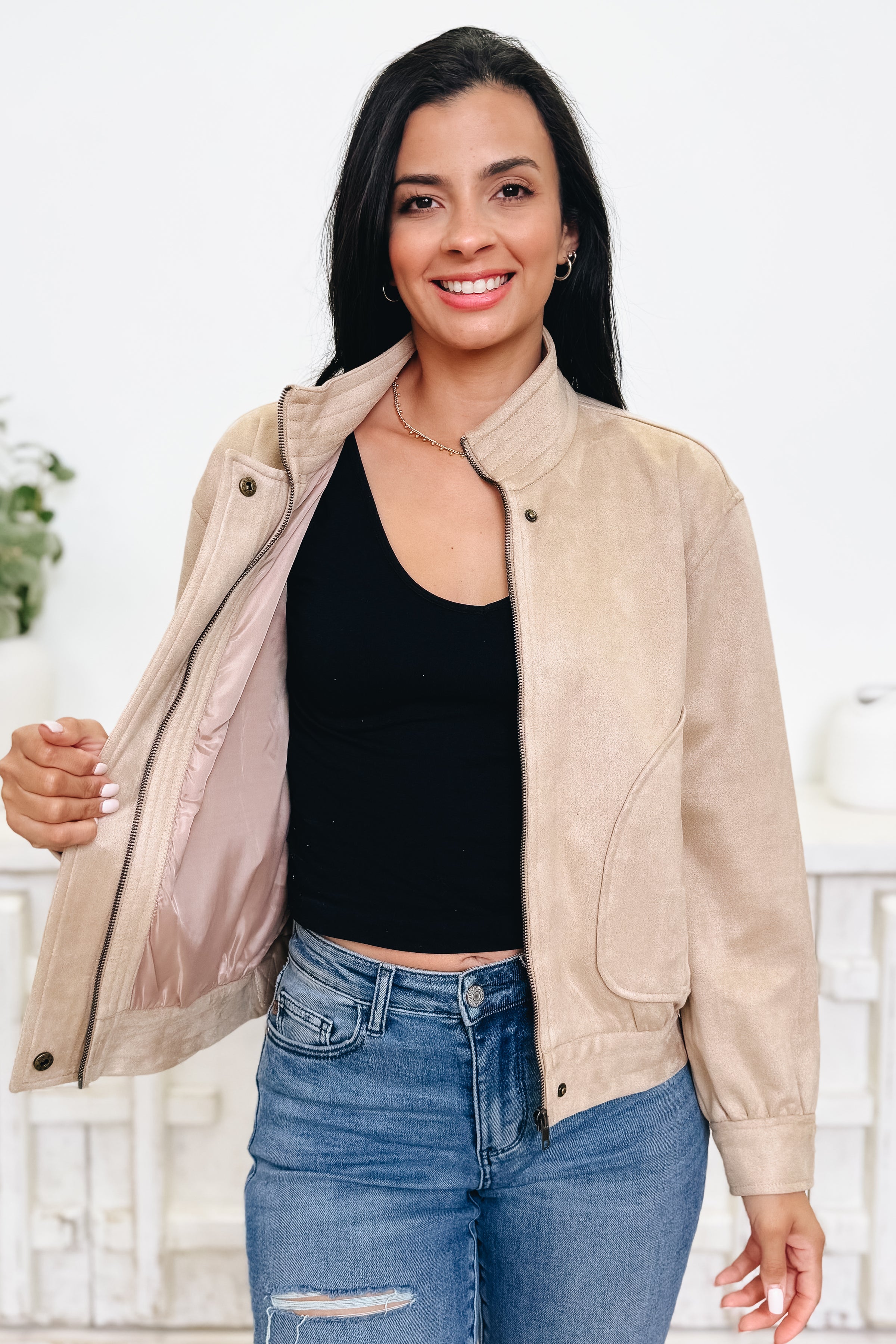 Keep it classic and effortlessly cool with this sleek faux suede jacket. Featuring a soft, luxe feel and a structured silhouette, it’s the perfect blend of polished and cozy. The zip-up front and roomy pockets add both function and style, while the neutral tone makes it easy to pair with anything in your closet. Dress it up with denim and booties or keep it casual with leggings — either way, this jacket is a total must-have for any season.
