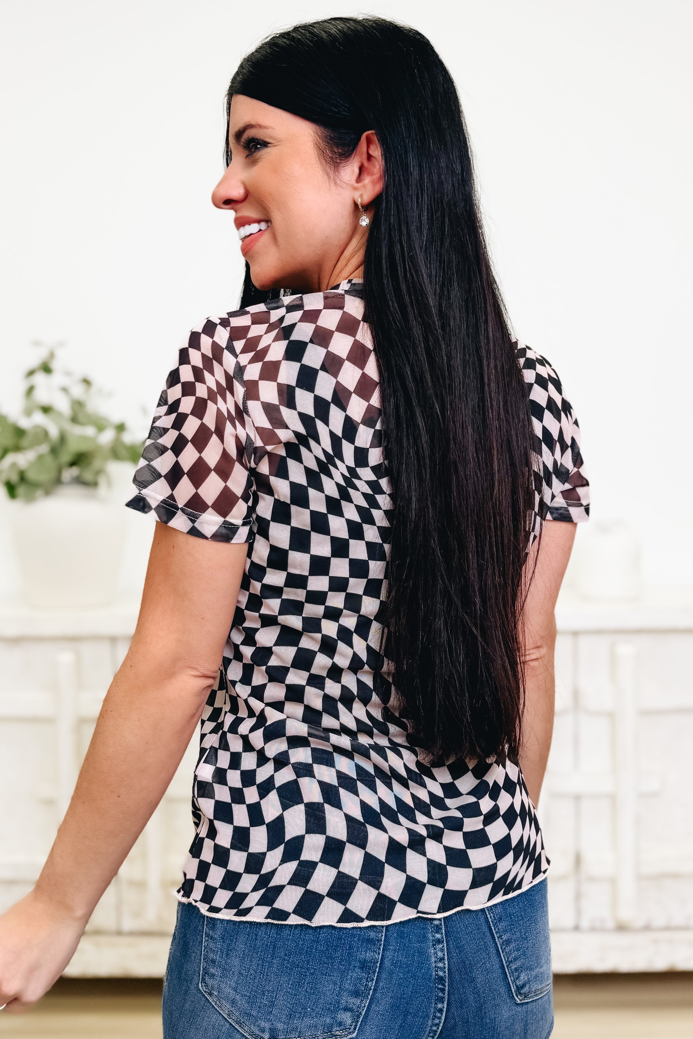 Meet your new favorite layering piece! This adorable checkered mesh top combines playful multi-color vibes with a super soft, stretchy fabric that hugs you just right. The signature lettuce trim adds that extra touch of charm we're totally here for. Wear it solo for an edgy look or layer it over your favorite basics—either way, you'll be turning heads. Cute, comfy, and endlessly versatile!