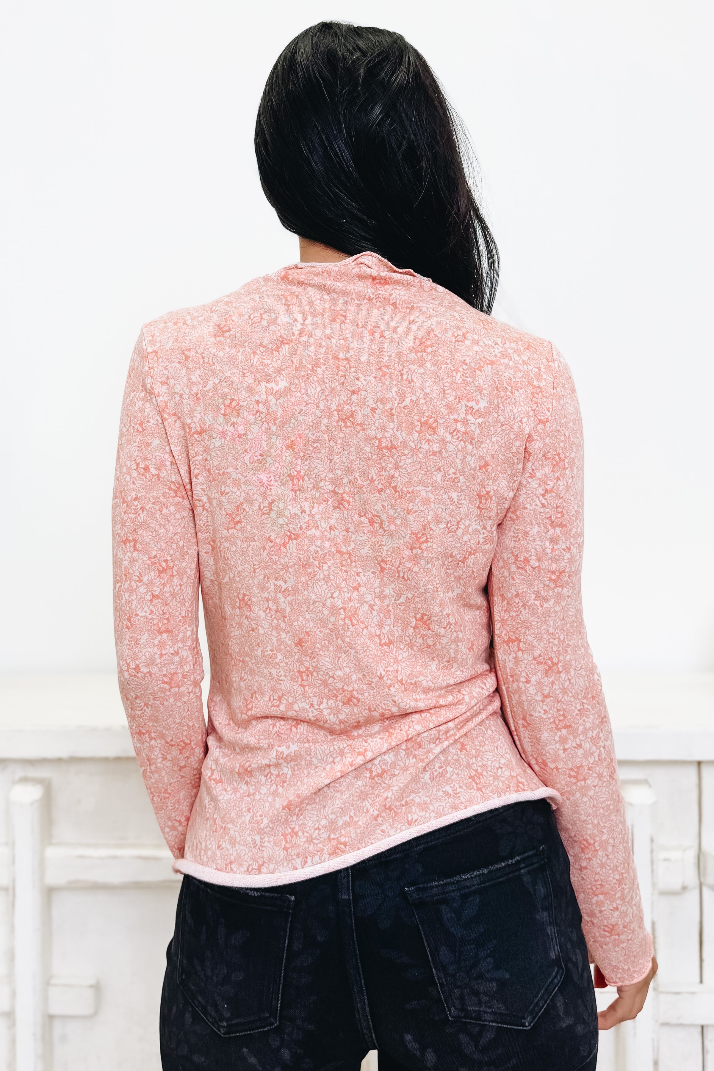 This top is sweet with a little sass! Featuring a soft, stretchy knit and a delicate floral print, it hugs just right without feeling clingy. The lightweight feel makes it perfect for layering, while the subtle ruffled/lettuce-edge trim at the neckline, cuffs, and hem adds that extra flirty touch. Easy to dress up with denim and boots or keep casual under a jacket — it’s a comfy-cute staple you’ll wear on repeat.
