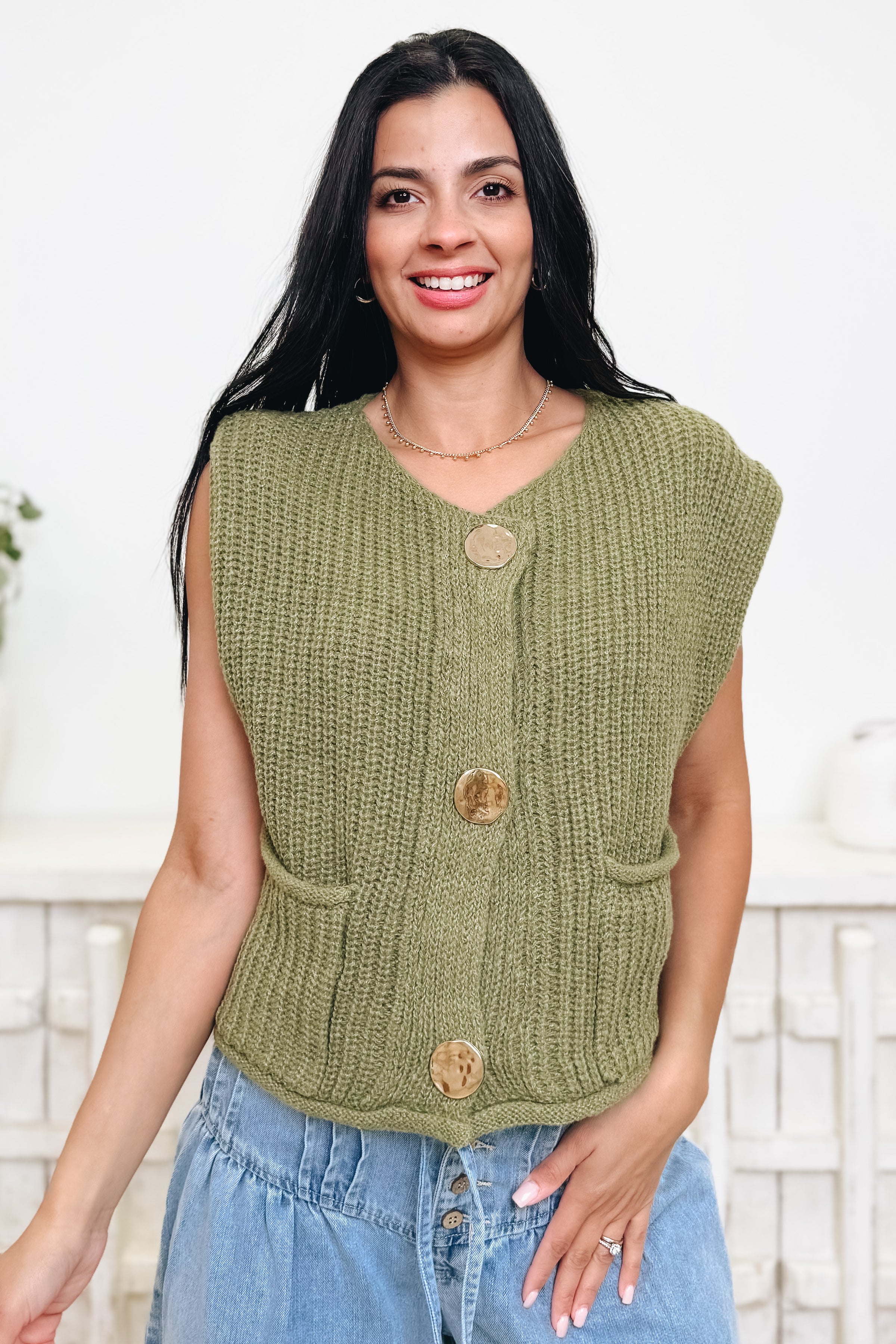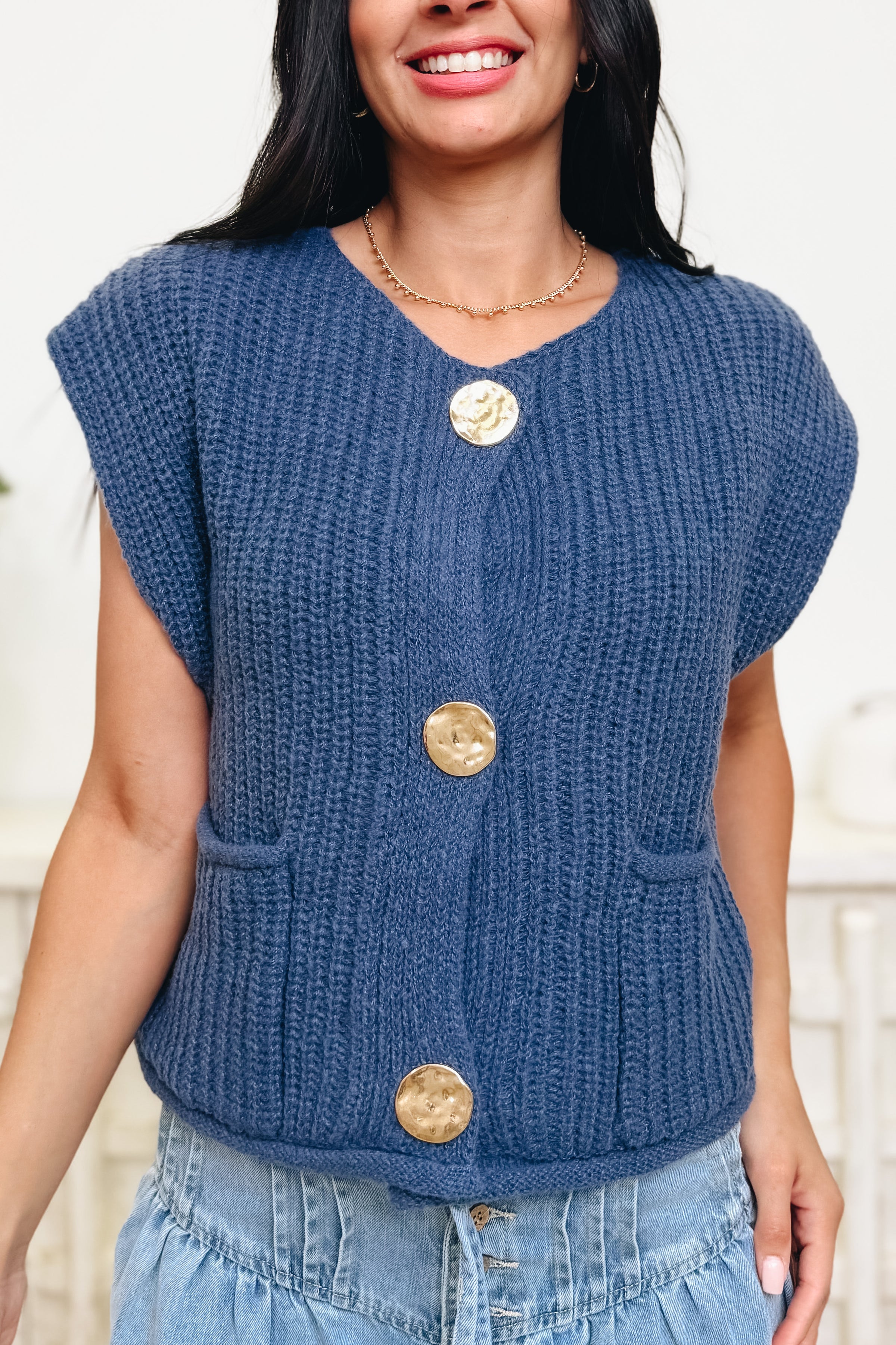We are totally obsessing over this sweater vest! Lightweight, buttery-soft, and nicely stretchy, it’s the kind of piece you’ll wear on repeat. The slight cap sleeves give it a sweet little upgrade, while the hammered buttons and front pockets add just the right touch of charm. And those colors? Absolutely dreamy. Your new go-to layer is calling — don’t miss it!