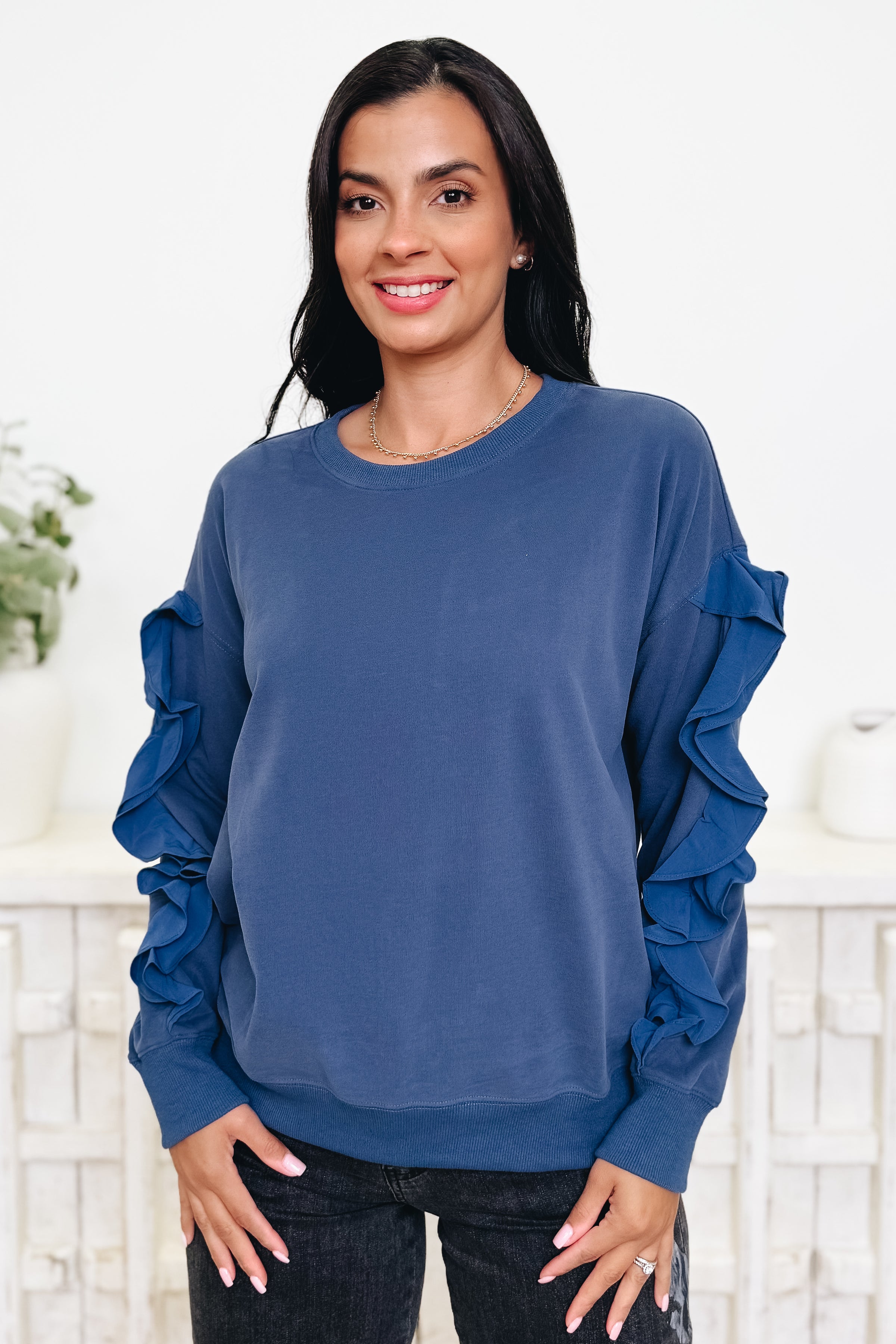 Girly meets glam with this statement sleeve moment! This sweater takes your everyday look up a notch with flirty ruffles running down the arms. The soft knit fabric keeps it comfy, while the bold design keeps it fun — perfect for days when you want to feel extra fabulous.