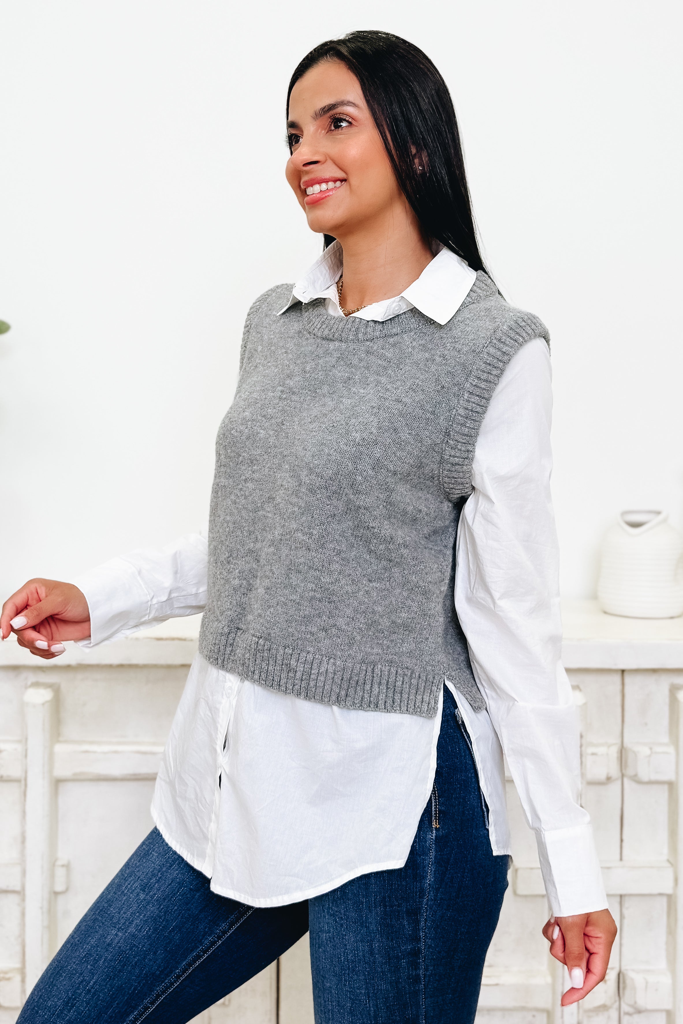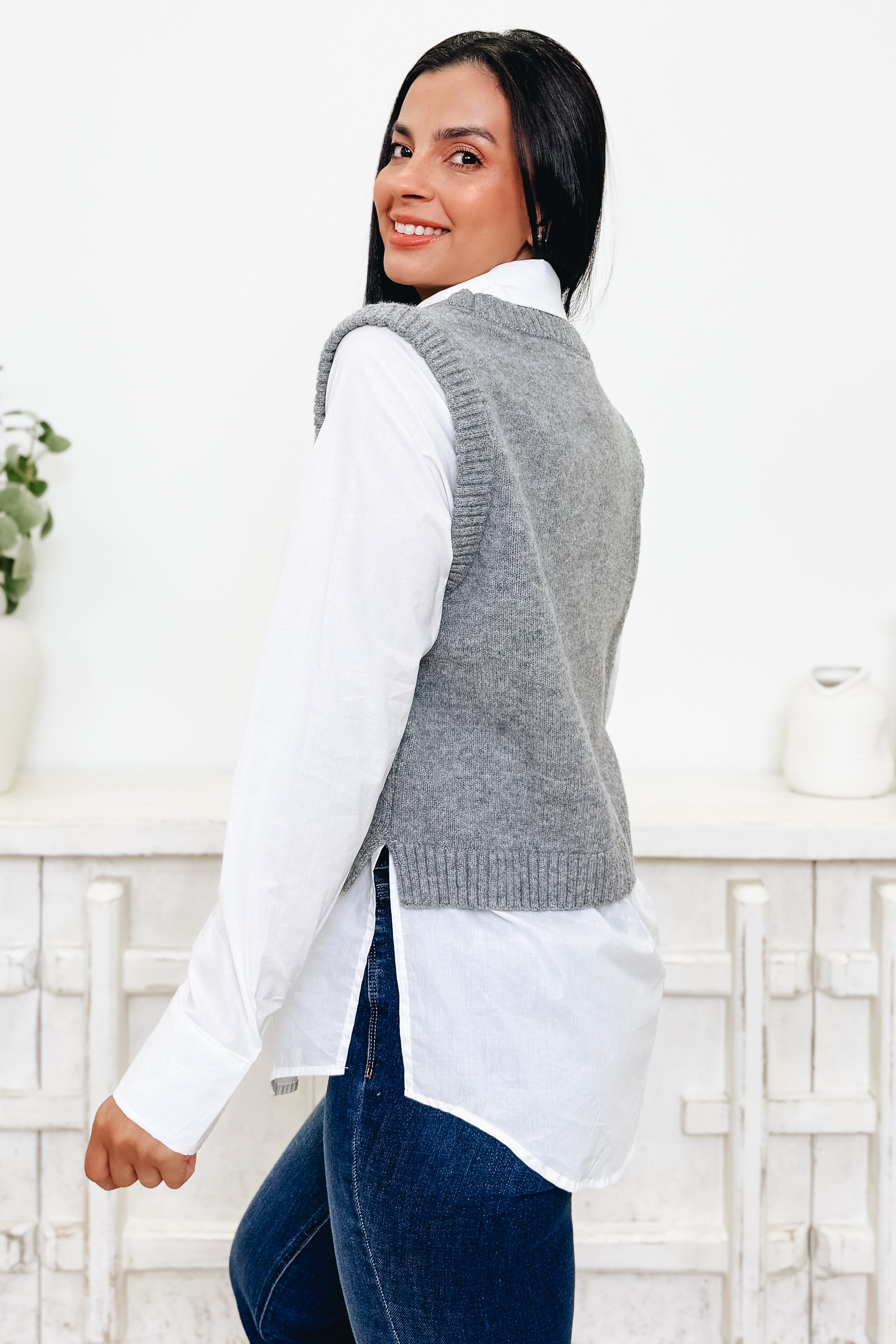 This classic one-piece that looks like a two-piece sweater vest and button-down is absolutely stunning! It nails the perfect casual-chic vibe with gorgeous coloring that effortlessly transitions from laid-back days to dressed-up nights. Versatile, stylish, and totally irresistible!