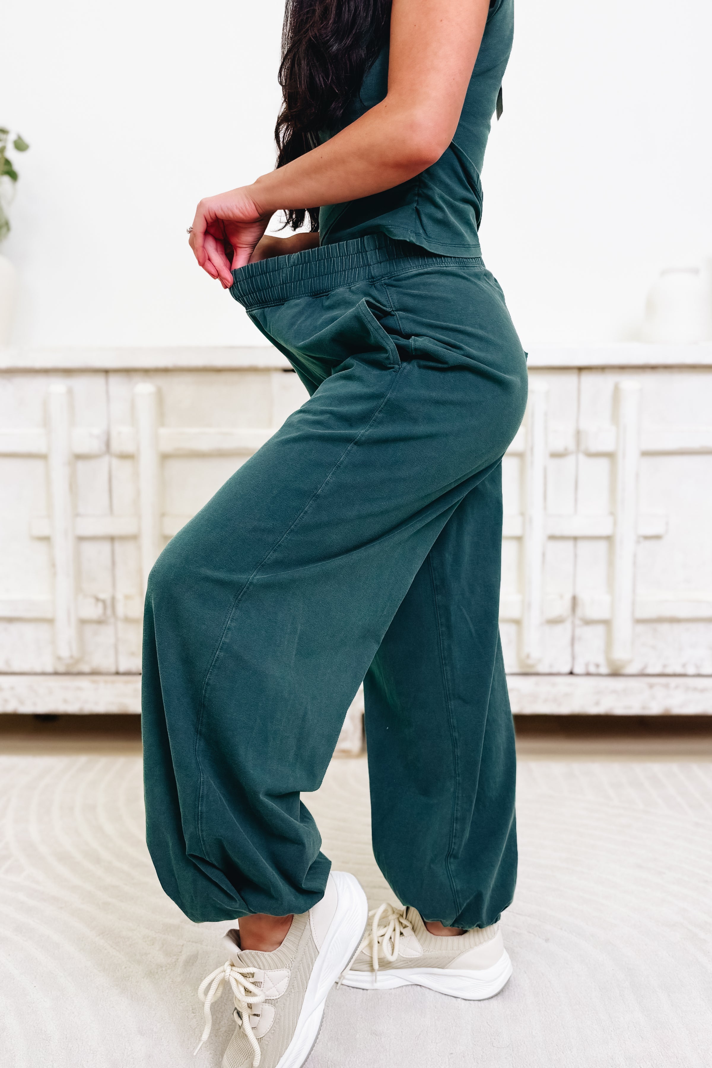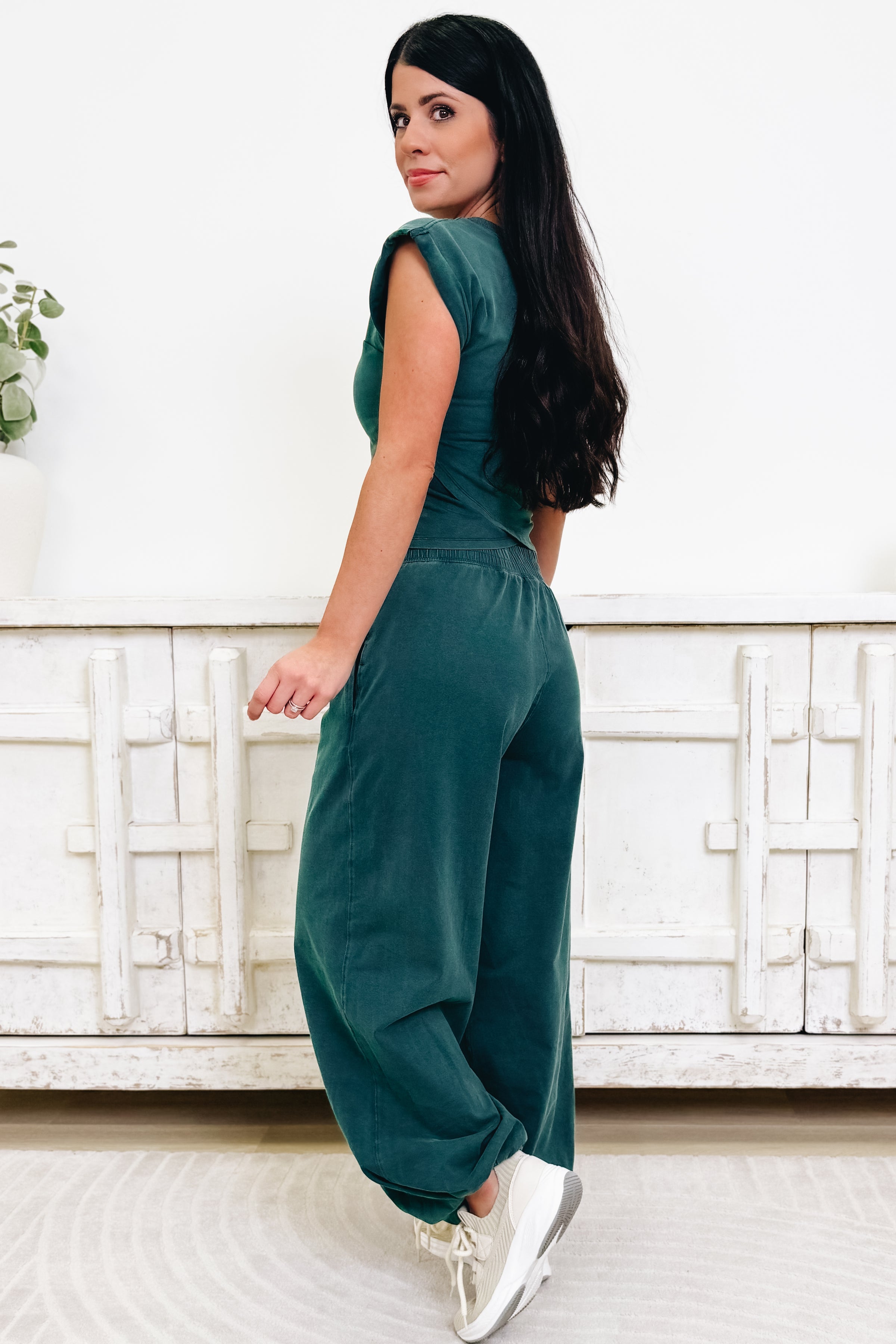 These jogger sweatpants are what cozy-day dreams are made of. Designed with a high-rise elastic waistband that’s stretchy and comfy, they drape into an easy, ultra-relaxed wide leg that pools just right at the ankles for that laid-back, street-style look. The fabric is a soft, midweight sweatshirt knit that feels broken-in from the first wear, giving you all the comfort of your oldest sweats with a way more elevated silhouette. The same washed blue-green mineral tone gives them that perfectly muted, lived-in color that still looks chic enough to style with a cute tee, a denim jacket, or the matching top for a full set you’ll want to live in.