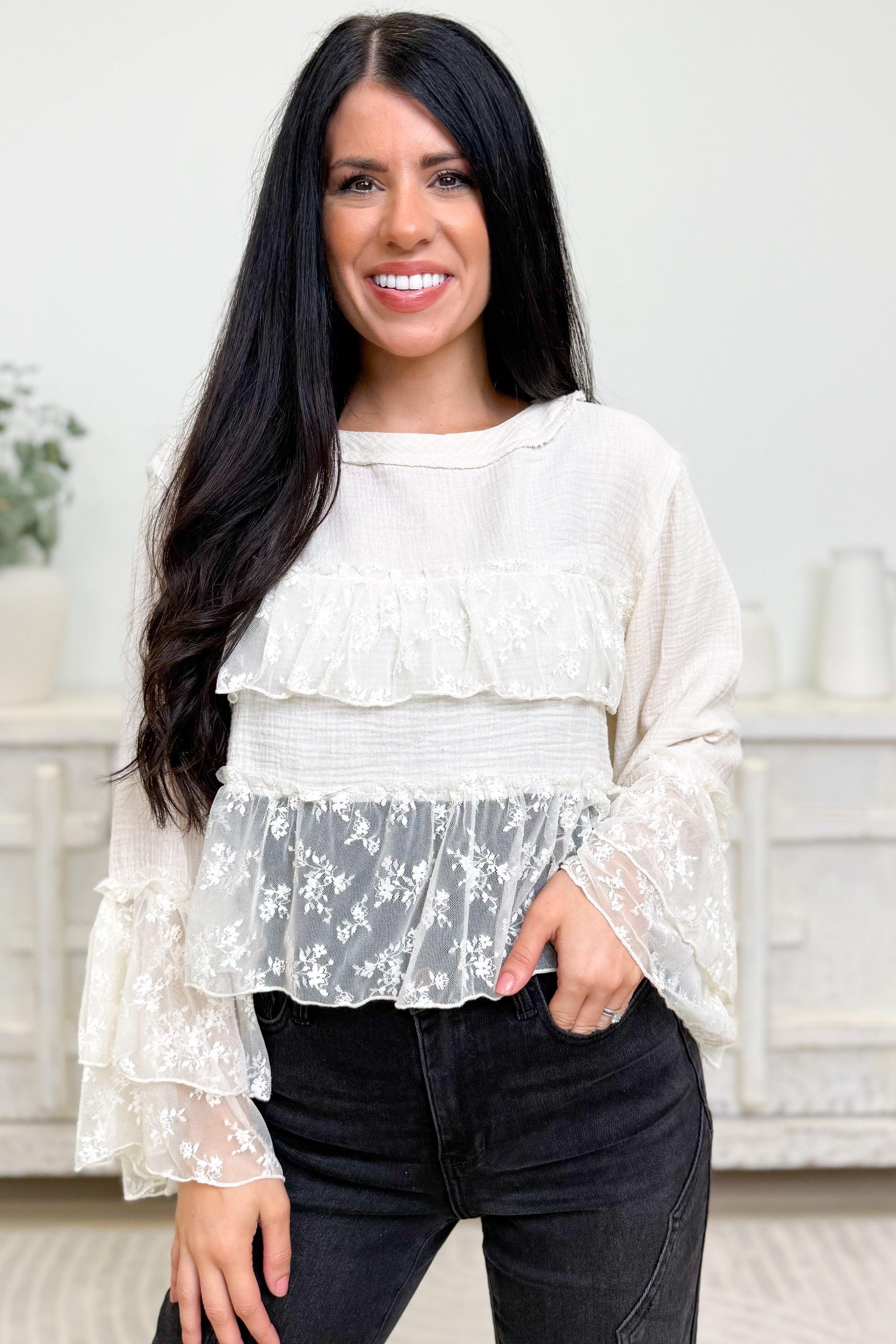 Soft, sweet, and just a little sassy—this top is giving effortless romance in the best way. The lightweight, airy fabric keeps it comfy all day, while those layered lace ruffles across the bodice add major “main character” texture. We’re obsessed with the dreamy bell sleeves finished with tiered lace that move so prettily when you do. Easy to dress up with jeans and booties or keep it casual with leggings—either way, it’s a total heart-stealer.