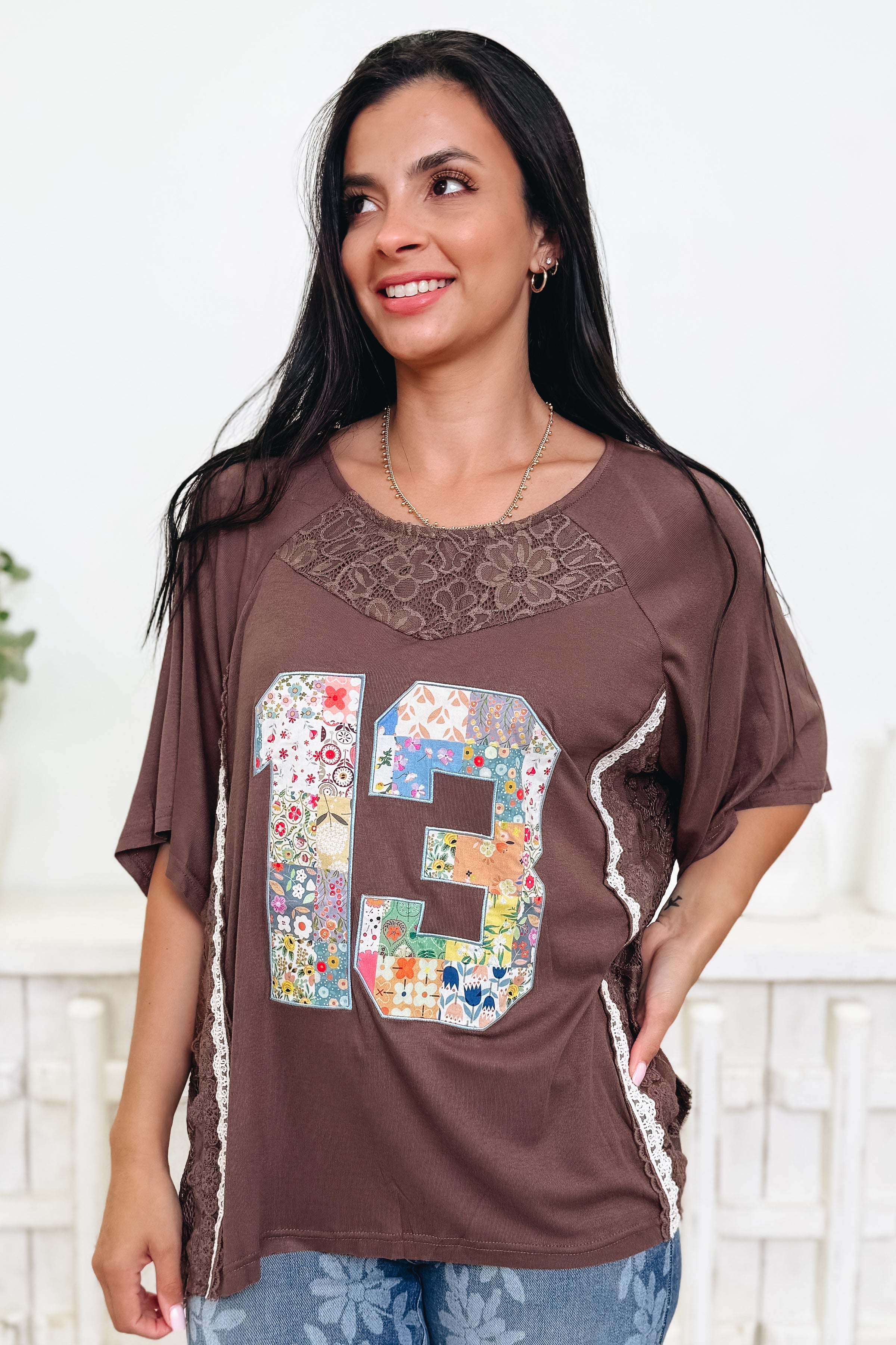 Flirty, floral, and full of charm! This lightweight, stretchy top flows like a dream and feels cool to the touch. The bold #13 in floral print steals the show, while the lace overlay adds that sweet, sassy vibe. Total coverage, total comfort—totally magical.