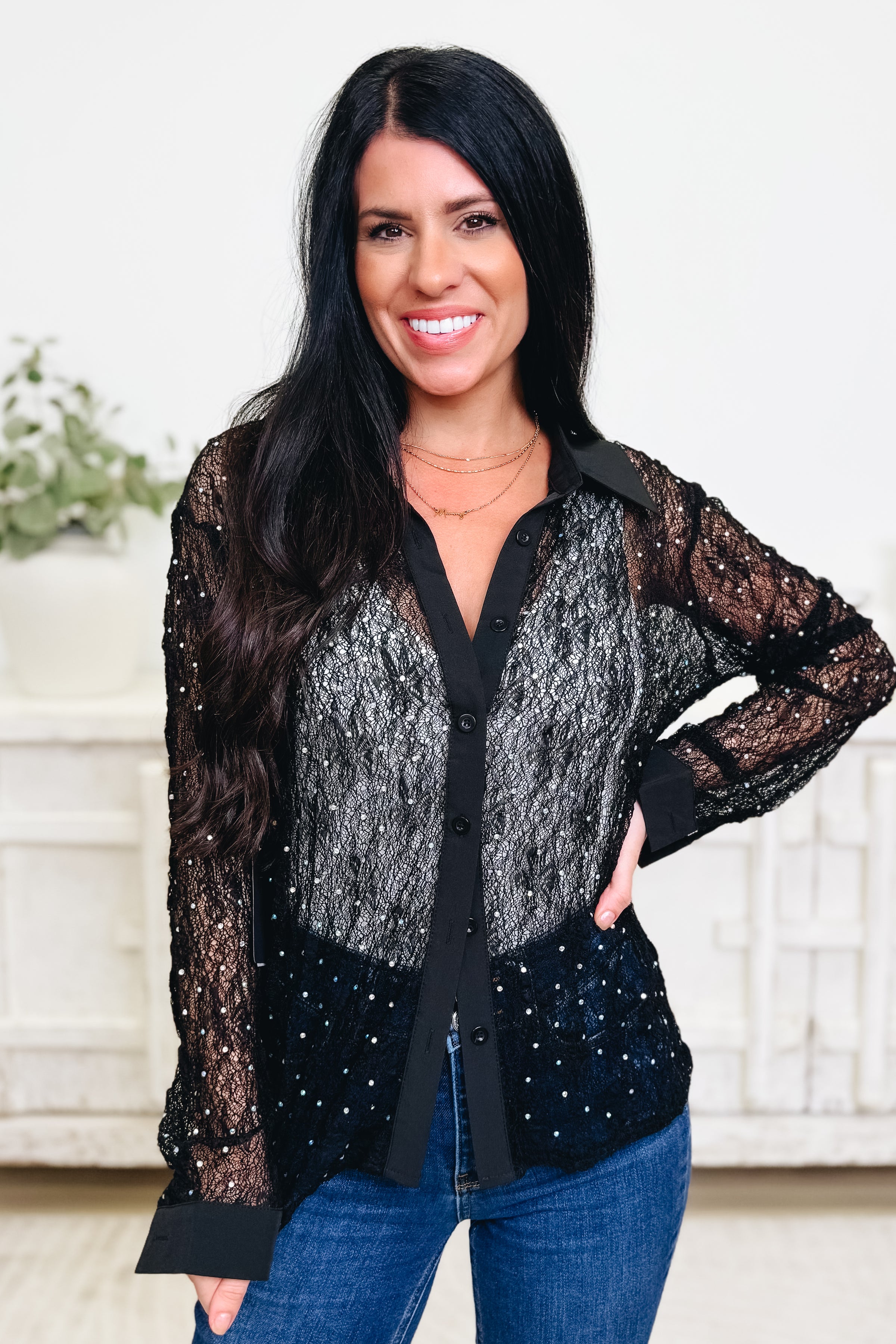 Meet your new go-to button-down that's basically magic in fabric form. Mesh and lace come together with gorgeous AB crystal accents that sparkle with every move, while real functioning buttons make getting dressed actually fun. Super lightweight and breathable, this top keeps you cool and looking incredible whether you're out making moves or just living your best life. It's the kind of piece that makes you feel like the main character—effortlessly chic, undeniably perfect.