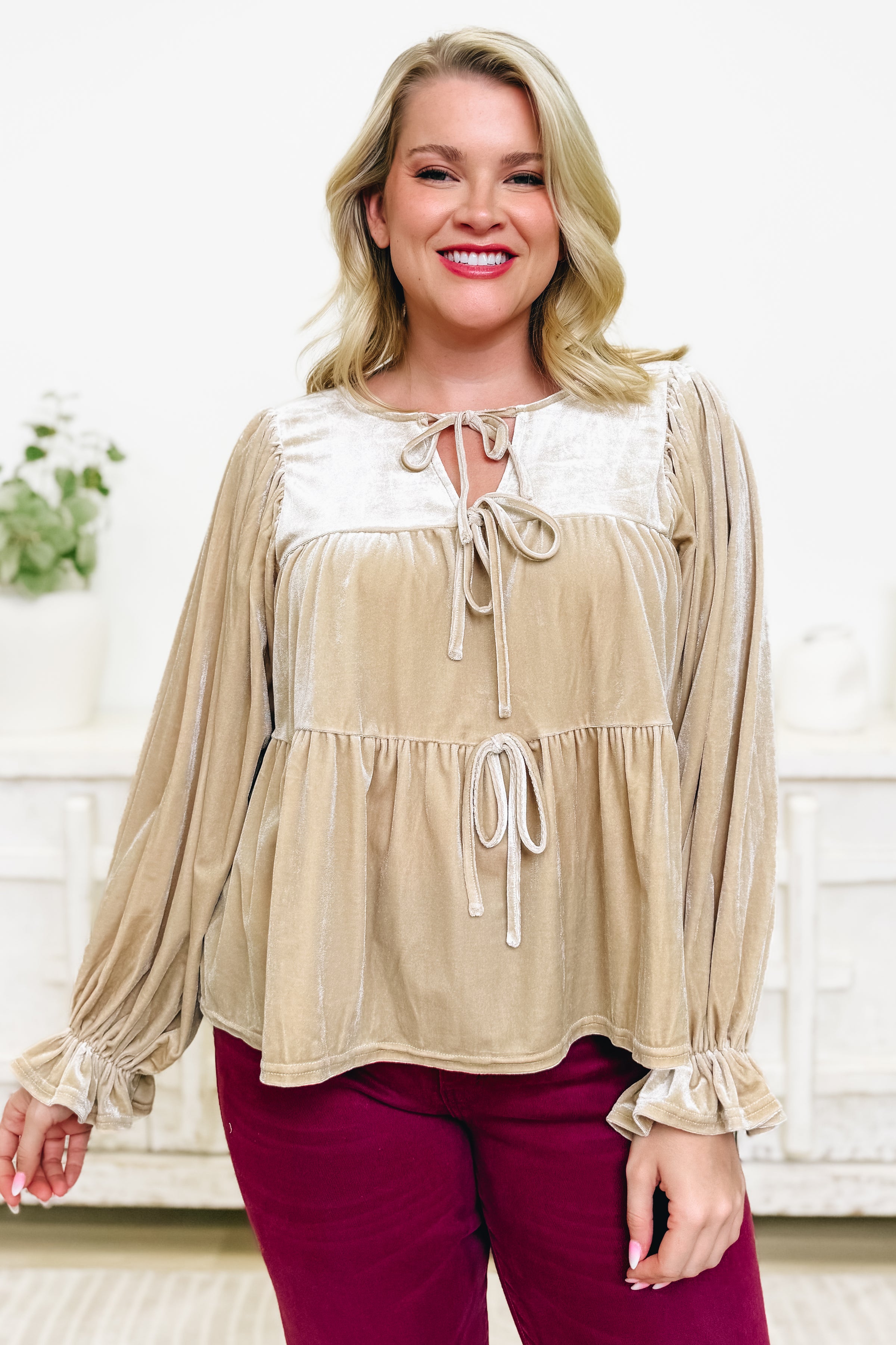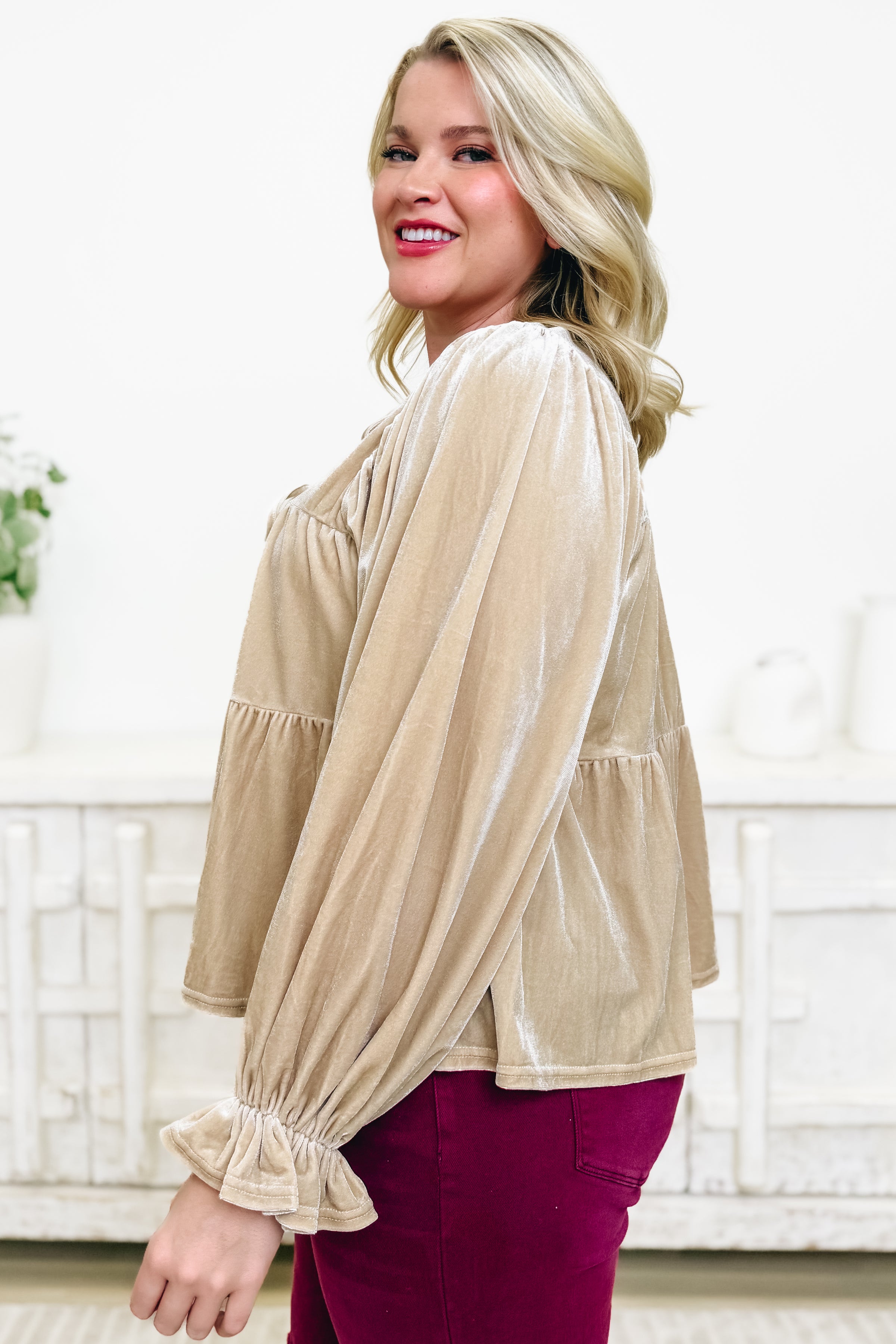 Soft, feminine, and oh-so-luxurious! This velvet tiered top is pure perfection with its flowy fit, dreamy texture, and adorable bow-tie details. The billowy sleeves add that extra touch of glam, making it perfect for holiday parties, date nights, or just feeling a little extra fabulous any day of the week. Pair it with leather leggings or denim for the ultimate chic look!