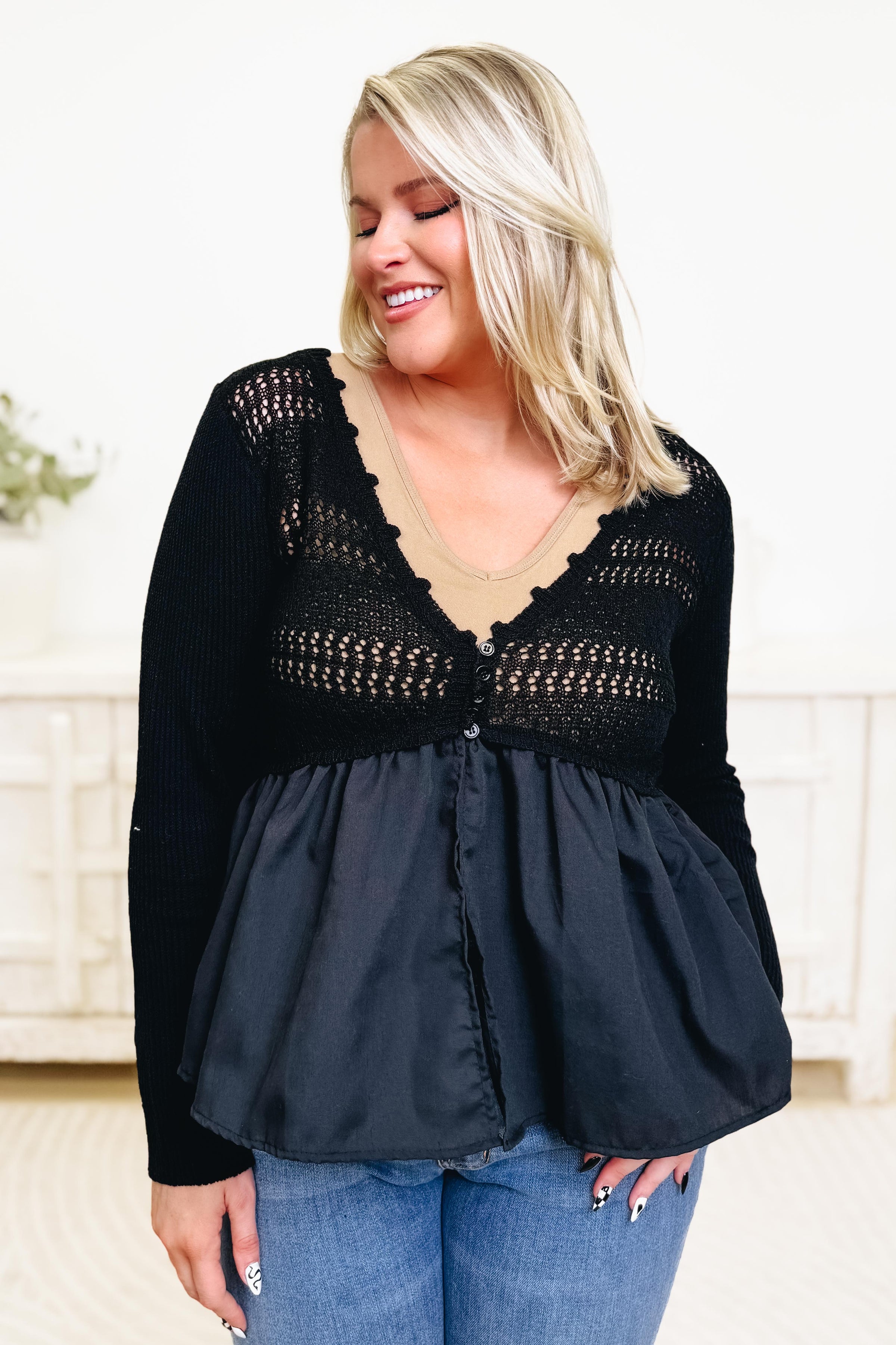 This is the most perfect open knit top and we are truly OBSESSED 🤍 It features functioning buttons for that cute, easy styling moment, and the fabric is unbelievably soft with just the right amount of stretch. It’s lightweight and breathable while still giving you that cozy knit feel, making it perfect to wear buttoned up on its own or layered over a tank. Comfy, flattering, and an instant go-to you’ll reach for on repeat!