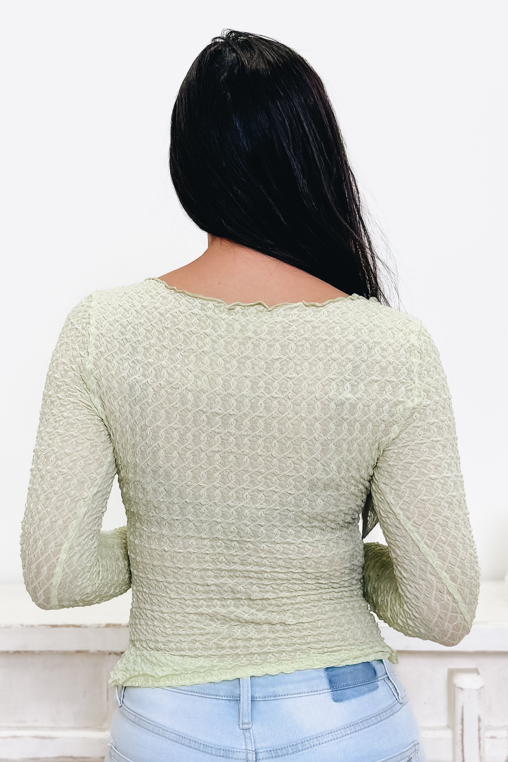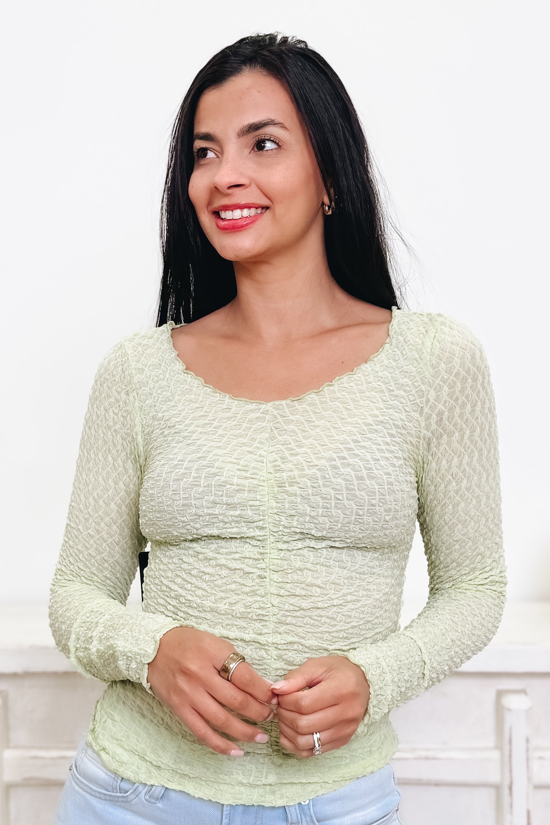 This flattering top is the perfect blend of feminine style and everyday comfort. Designed with a soft, stretchy smocked fabric, it creates a beautiful textured look while offering a flexible, comfortable fit. The ruched front detail adds a flattering touch that enhances the silhouette, while the scoop neckline keeps the look effortlessly chic. Finished with long sleeves and a slightly cropped length, this top pairs perfectly with your favorite high-rise denim for an easy, stylish outfit.